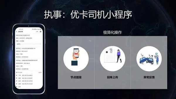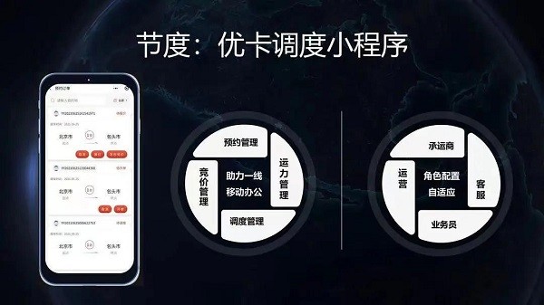 打開優(yōu)卡運車調(diào)度小程序——預(yù)約管理、調(diào)度管理;競價管理、運力管理;手機在手,操盤全國。承運商、運營商、客戶、業(yè)務(wù)員,所有角色自適應(yīng)配置,從訂單接收到車輛運抵的所有動作監(jiān)管,從車隊數(shù)字化管理到對線路匹配,再到運力調(diào)撥進行資源優(yōu)化,最終實現(xiàn)降本增效。