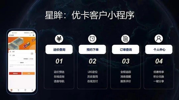 優(yōu)卡運車客戶小程序——簡潔的交互界面,功能區(qū)分一目了然,即使用戶首次使用也能快速上手、查詢界面可以預(yù)估運價與導(dǎo)航,下單界面可以實現(xiàn)定位與支付,訂單界面可以實時顯示車輛的在途位置。