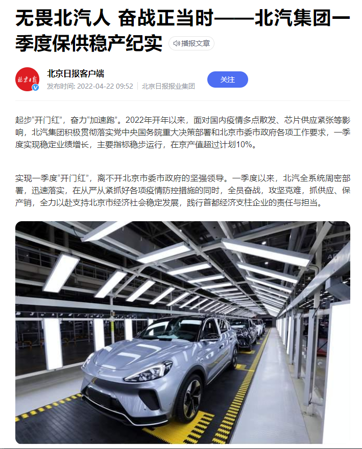 起步“開門紅”,奮力“加速跑”。2022年開年以來,面對(duì)國(guó)內(nèi)疫情多點(diǎn)散發(fā)、芯片供應(yīng)緊張等影響,北汽集團(tuán)積極貫徹落實(shí)黨中央國(guó)務(wù)院重大決策部署和北京市委市政府各項(xiàng)工作要求,一季度實(shí)現(xiàn)穩(wěn)定業(yè)績(jī)?cè)鲩L(zhǎng),主要指標(biāo)穩(wěn)步運(yùn)行,在京產(chǎn)值超過計(jì)劃10%。