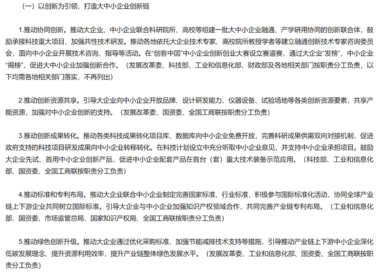 《攜手行動》提到要從推進協(xié)同創(chuàng)新、推進創(chuàng)新資源共享、推進創(chuàng)新成果轉化、推動標準和專利布局、推動綠色創(chuàng)新升級,五方面打造大中小企業(yè)創(chuàng)新鏈。
