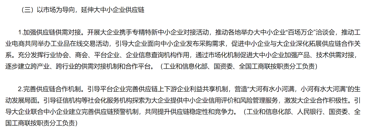《攜手行動》提到要從加強供應鏈供需對接,完善供應鏈合作機制兩方面延伸大中小企業(yè)供應鏈。