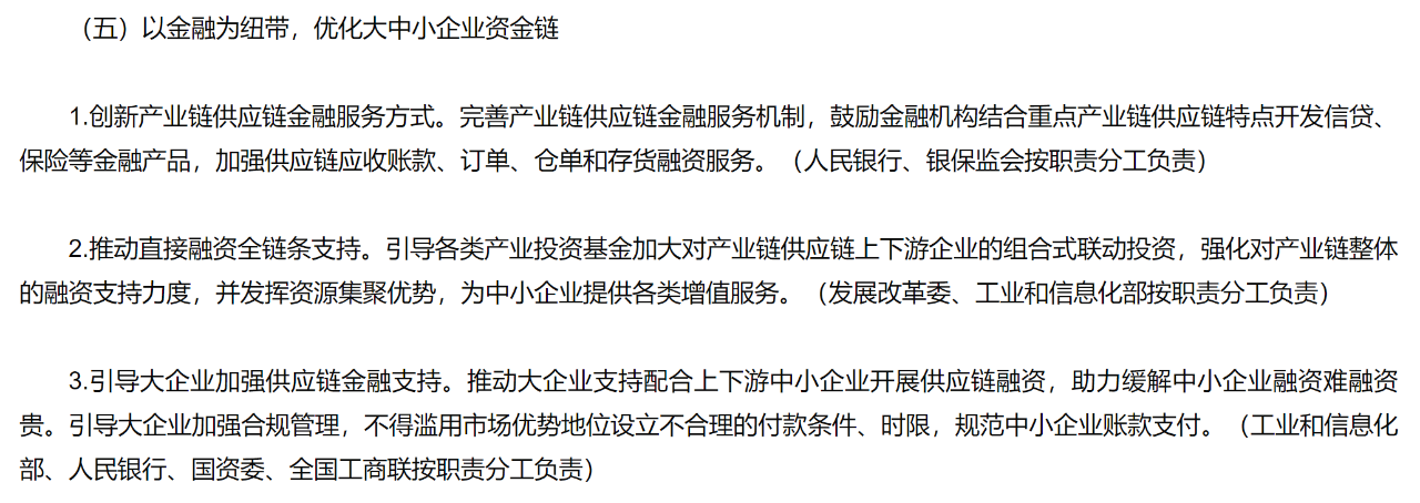 《攜手行動》提到要創(chuàng)新產(chǎn)業(yè)鏈供應鏈金融服務方式,推動直接融資全鏈條支持,引導大企業(yè)加強供應鏈金融支持。