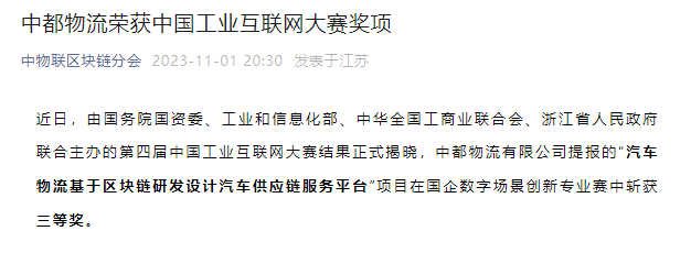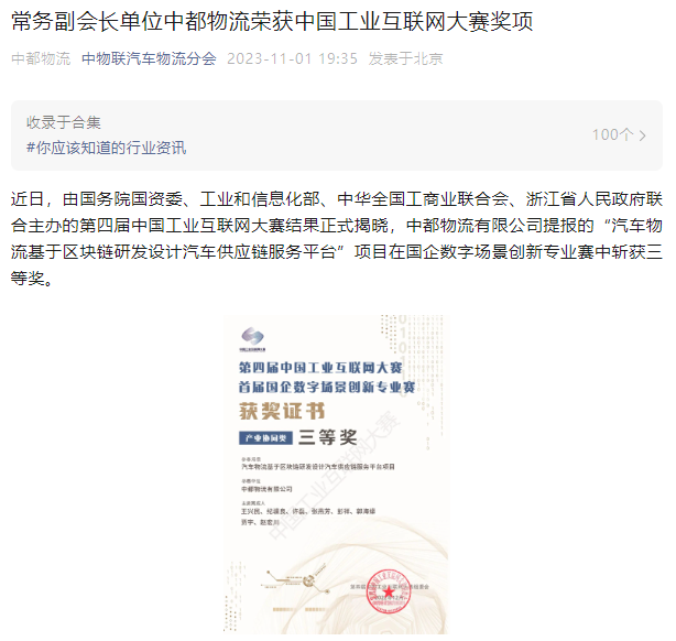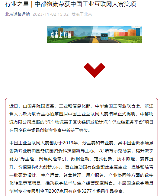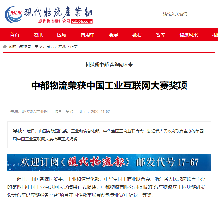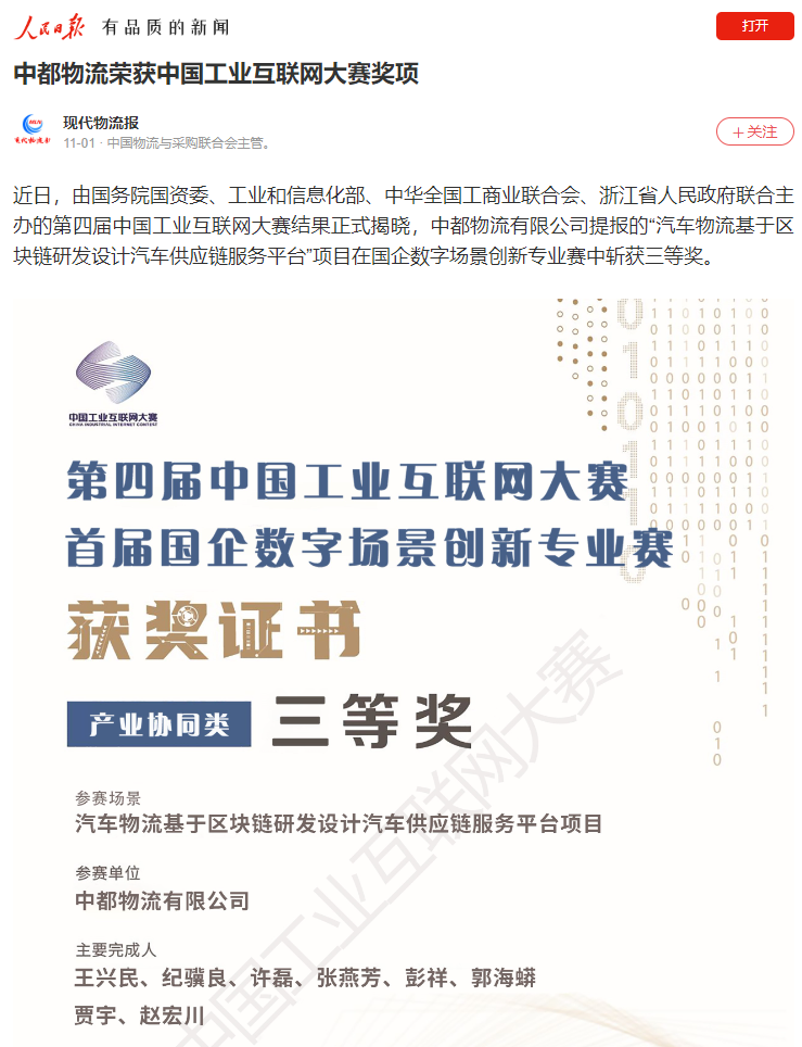 獲獎(jiǎng)信息受到行業(yè)內(nèi)外廣泛關(guān)注,央媒、行業(yè)協(xié)會、行業(yè)權(quán)威媒體、各大實(shí)力媒體聚焦中都物流,人民日報(bào)端、現(xiàn)代物流報(bào)、搜狐、今日頭條等多家媒體轉(zhuǎn)載中都物流榮獲中國工業(yè)互聯(lián)網(wǎng)大賽獎(jiǎng)項(xiàng)信息。