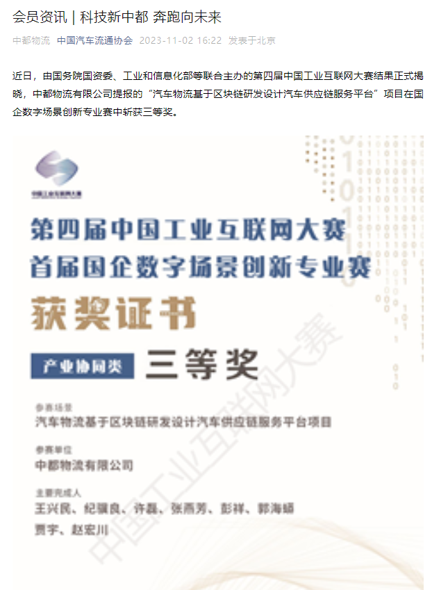 近日,中都物流秉承“科技驅(qū)動型智慧物流企業(yè)”定位,探索前沿技術(shù),提報(bào)“汽車物流基于區(qū)塊鏈研發(fā)設(shè)計(jì)汽車供應(yīng)鏈服務(wù)平臺”項(xiàng)目,榮獲第四屆中國工業(yè)互聯(lián)網(wǎng)大賽國企數(shù)字場景創(chuàng)新專業(yè)賽三等獎(jiǎng)。